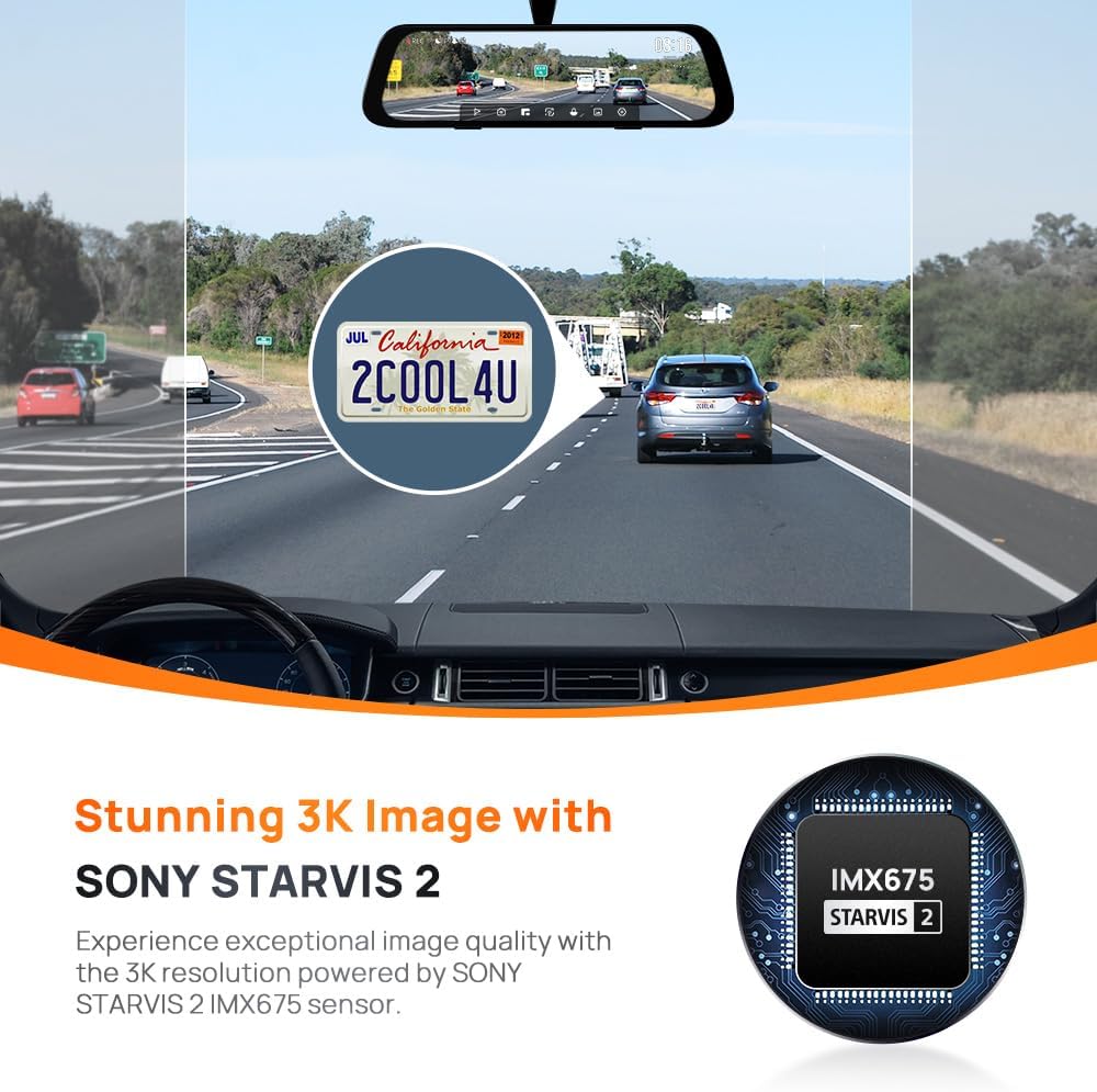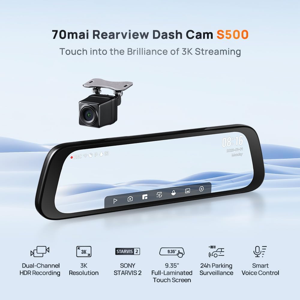 70mai Rearview Dash Cam S500 Touch into the Brilliance of 3K Streaming 9.35” Full-Laminated Touch Screen 3K HDR Image Dual-Channel Recording Super Capacitor Solution Voice Control